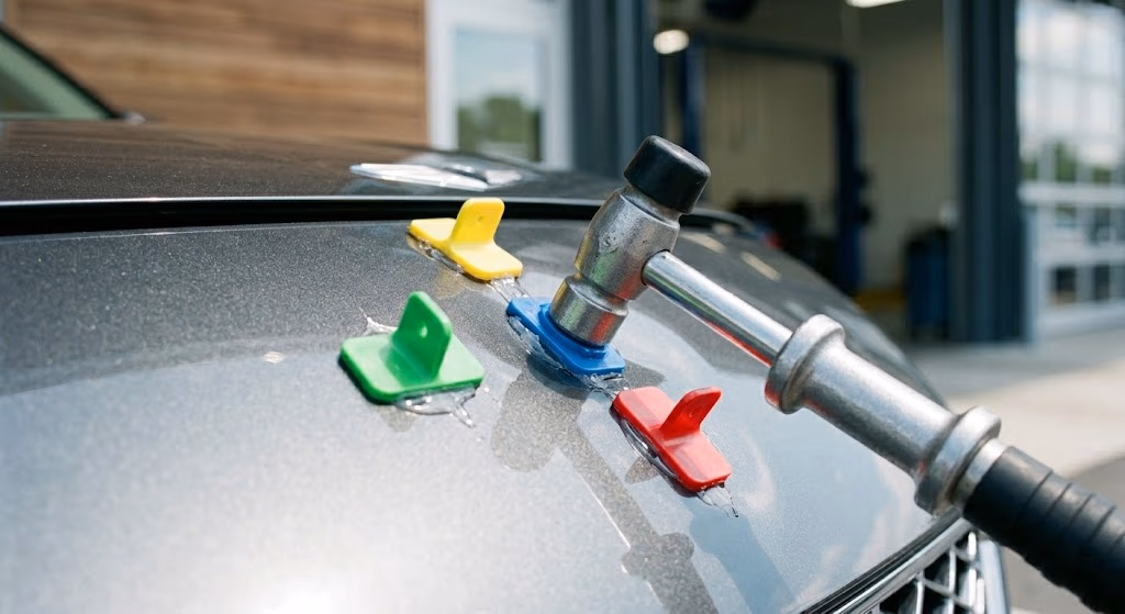고속도로 주행 중 날아온 돌에 맞아 본넷 캐릭터 라인이 뭉개진 케이스입니다. GV80 본넷은 알루미늄 재질이라 탄성이 강해 복원이 까다롭습니다. 로드 진입이 불가능한 이중 접합 부위라 '글루 덴트(Glue Pulling)' 방식을 사용했습니다. 도장 손상 없이 철판의 텐션만 이용하여 원래 형상으로 100% 복구했습니다.